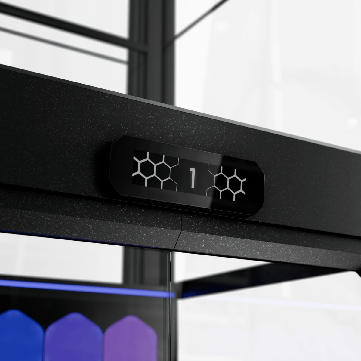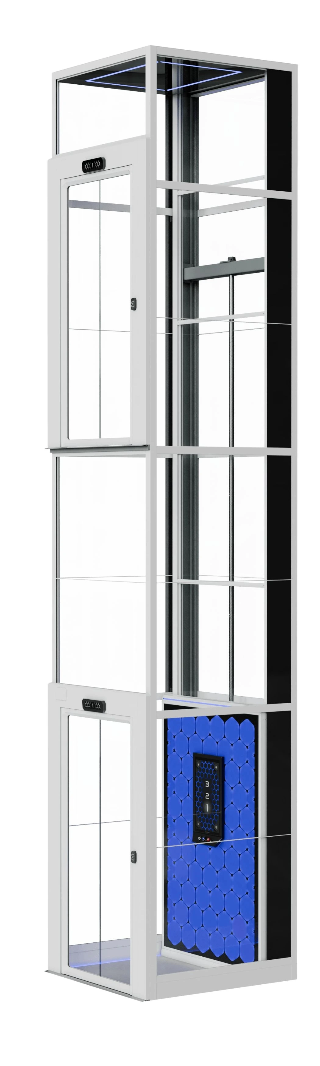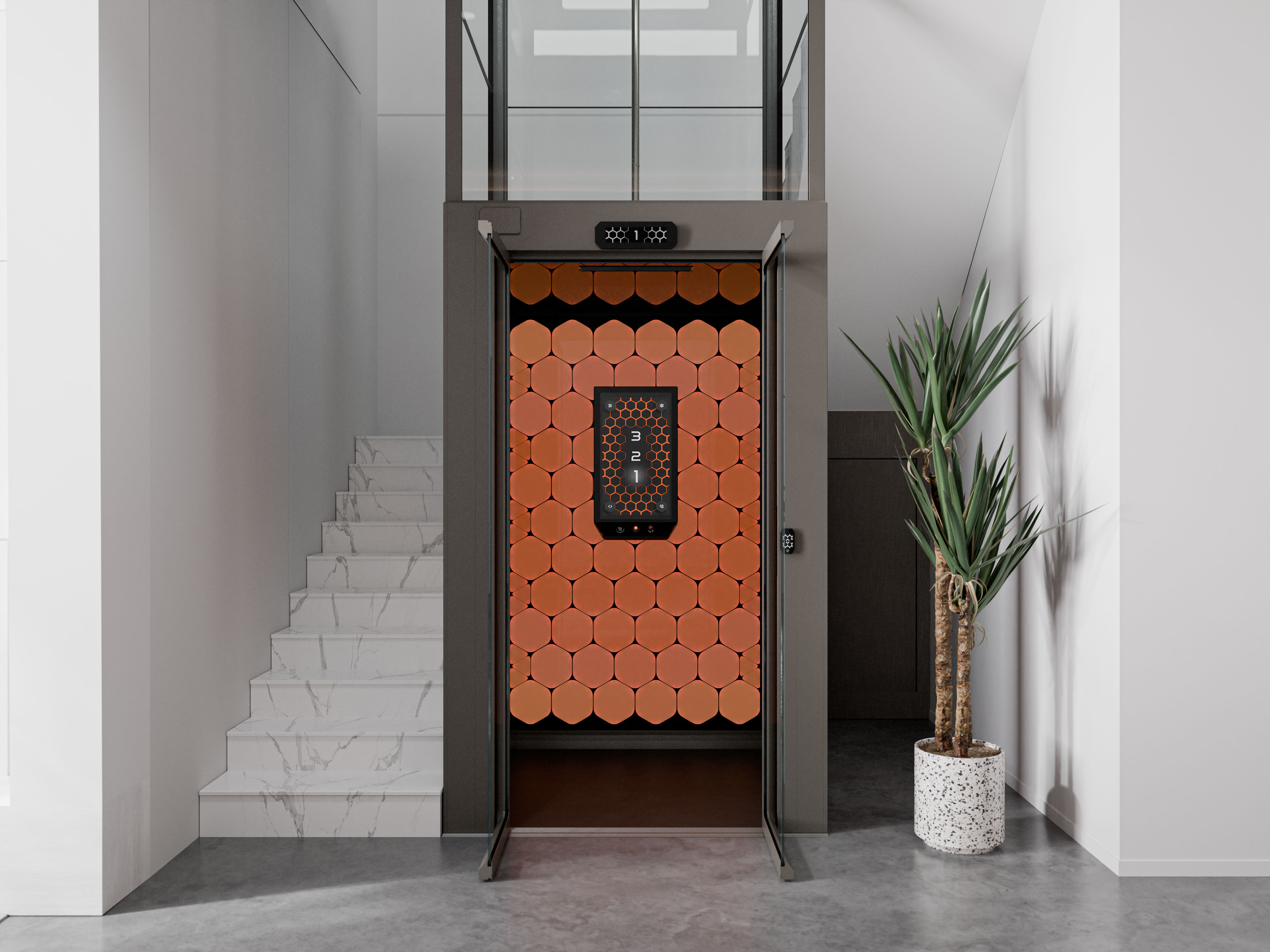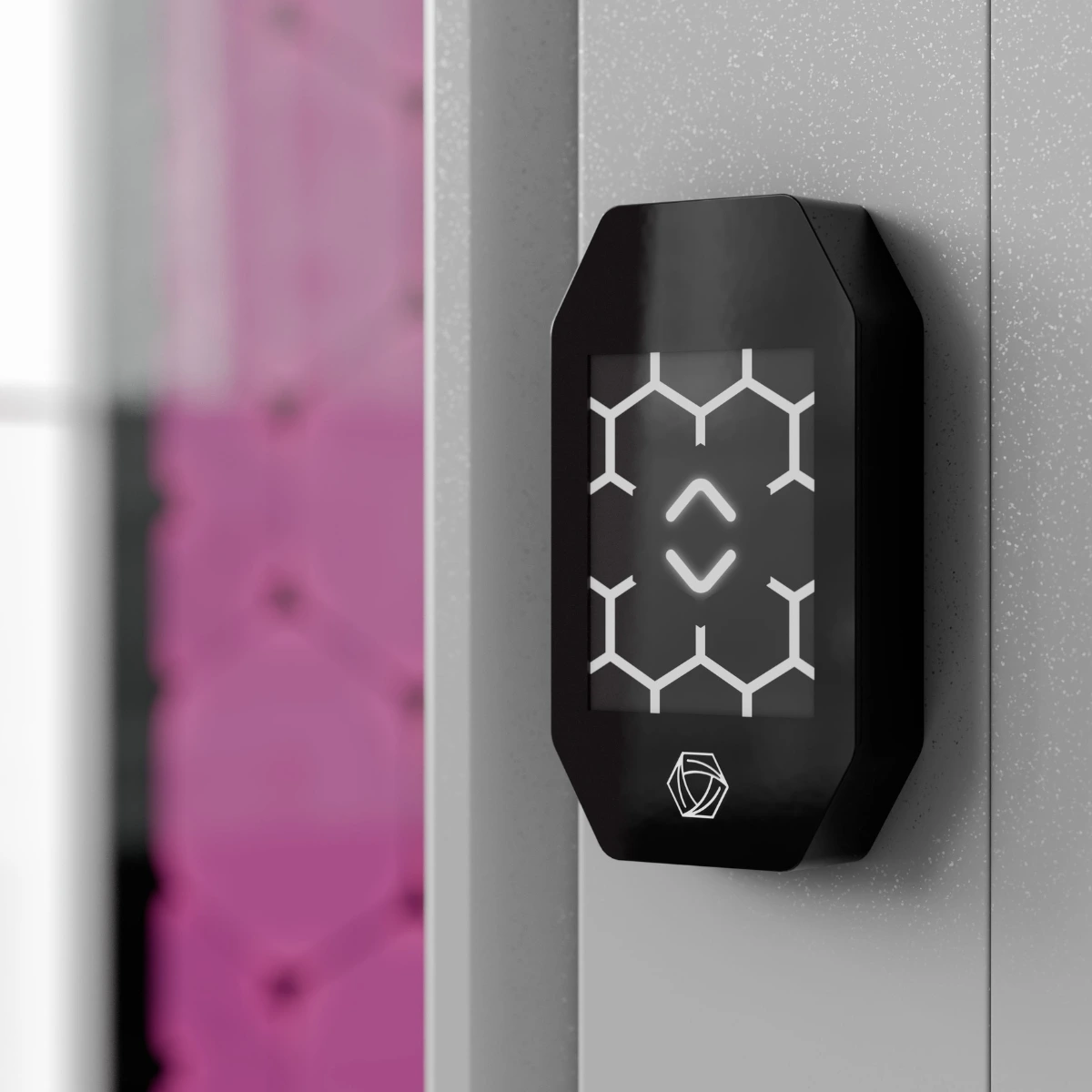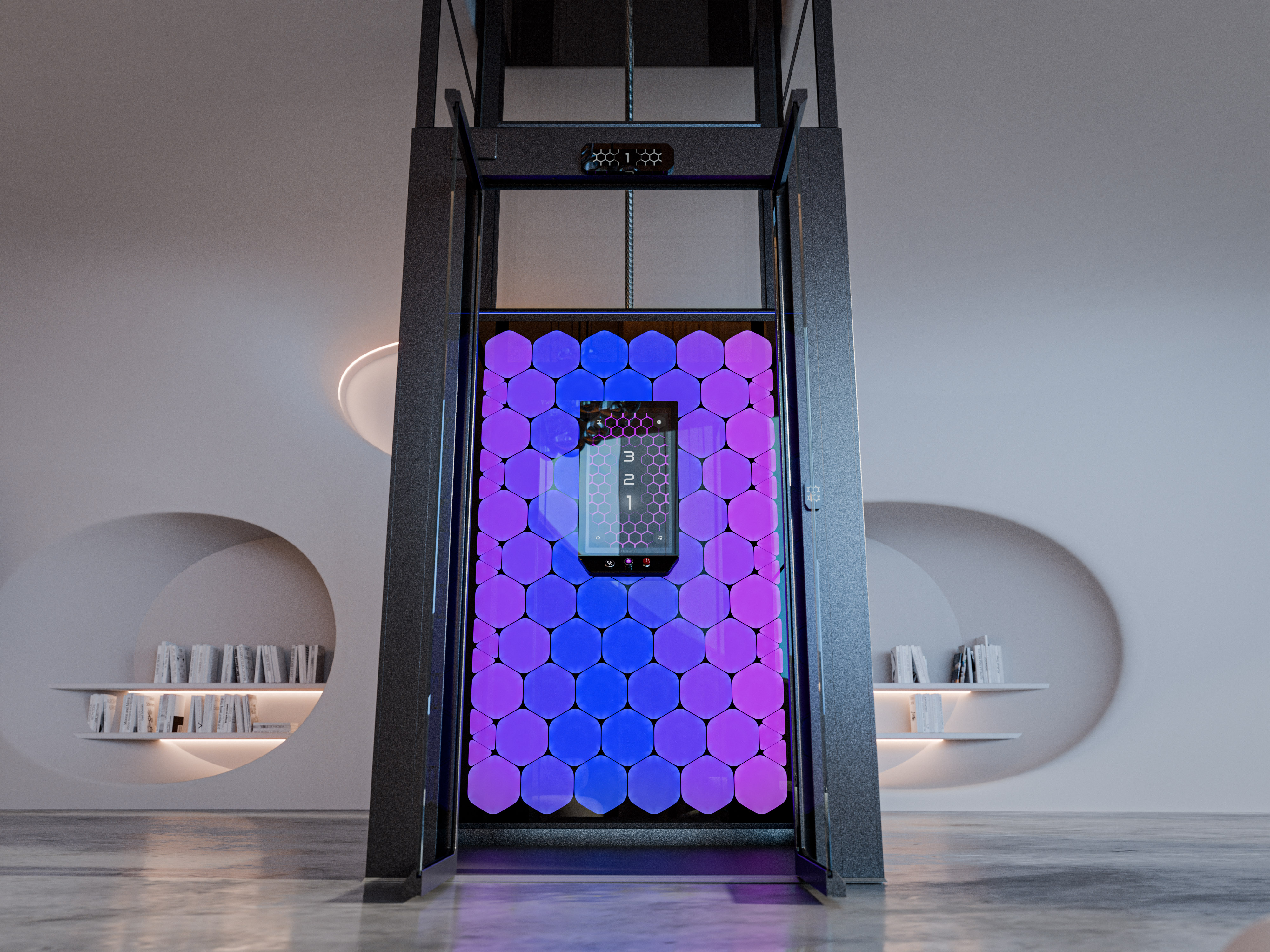 Panel bermotif sarang lebah dengan bingkai putih atau hitam, diterangi pencahayaan RGBW multi-warna dalam versi ACRYLIC, menciptakan efek yang hidup namun tetap elegan — menghadirkan sentuhan minimalis nan mewah pada interior lift.
